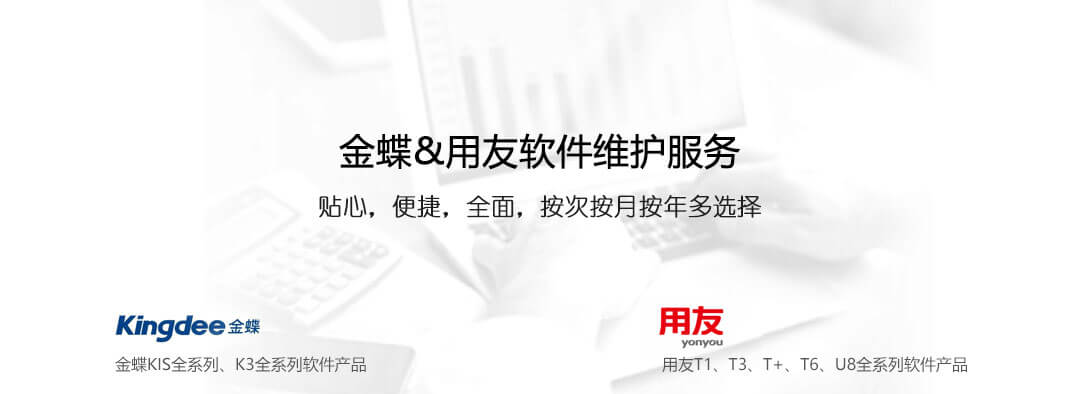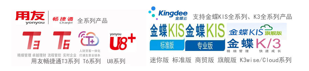 用友:畅捷通T3系列、T6系列、U8系列金蝶:迷你版、标准版、商贸版、旗舰版、K3wise/Cloud系列